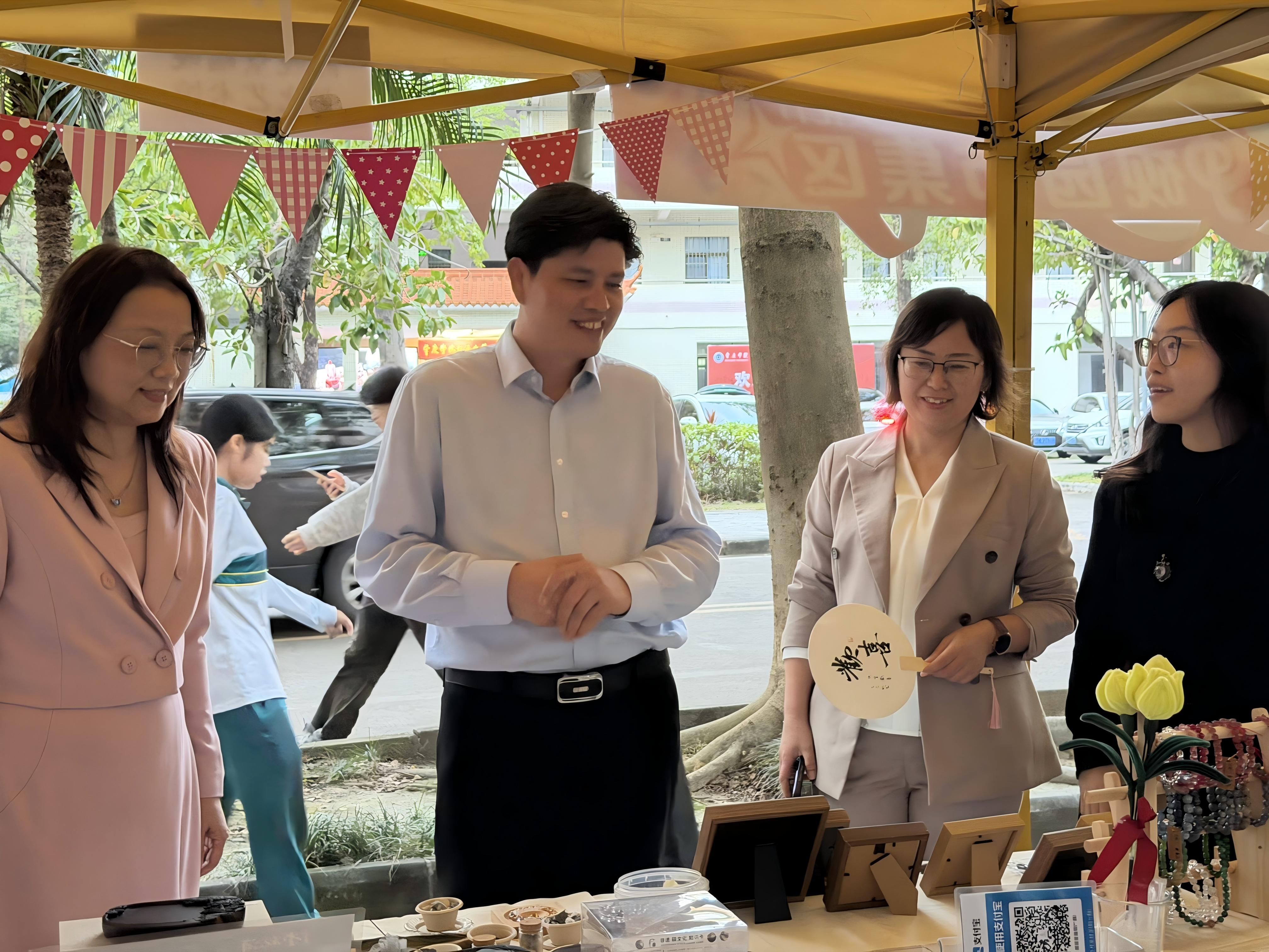 活动现场,欧洪湛走进创意集市区,与多位学生摊主亲切交流,细致询问产品创意、制作流程与市场反响。在原创手作摊位前,他认真听取学生的设计理念,对同学们结合专业所学开展创业实践表示充分肯定,并指出“要将专业知识与市场需求紧密结合,在实践中深化理解、提升能力”。他鼓励大家以市场反馈为契机,持续优化产品设计与服务模式,不断提升创新创业的实效性。欧洪湛强调,创意集市为同学们提供了专业实践向创业实践转化的重要平台,希望同学们继续保持敢想敢创的精神,在实干中锤炼专业能力与市场意识,让专业所学真正转化为成长所长。