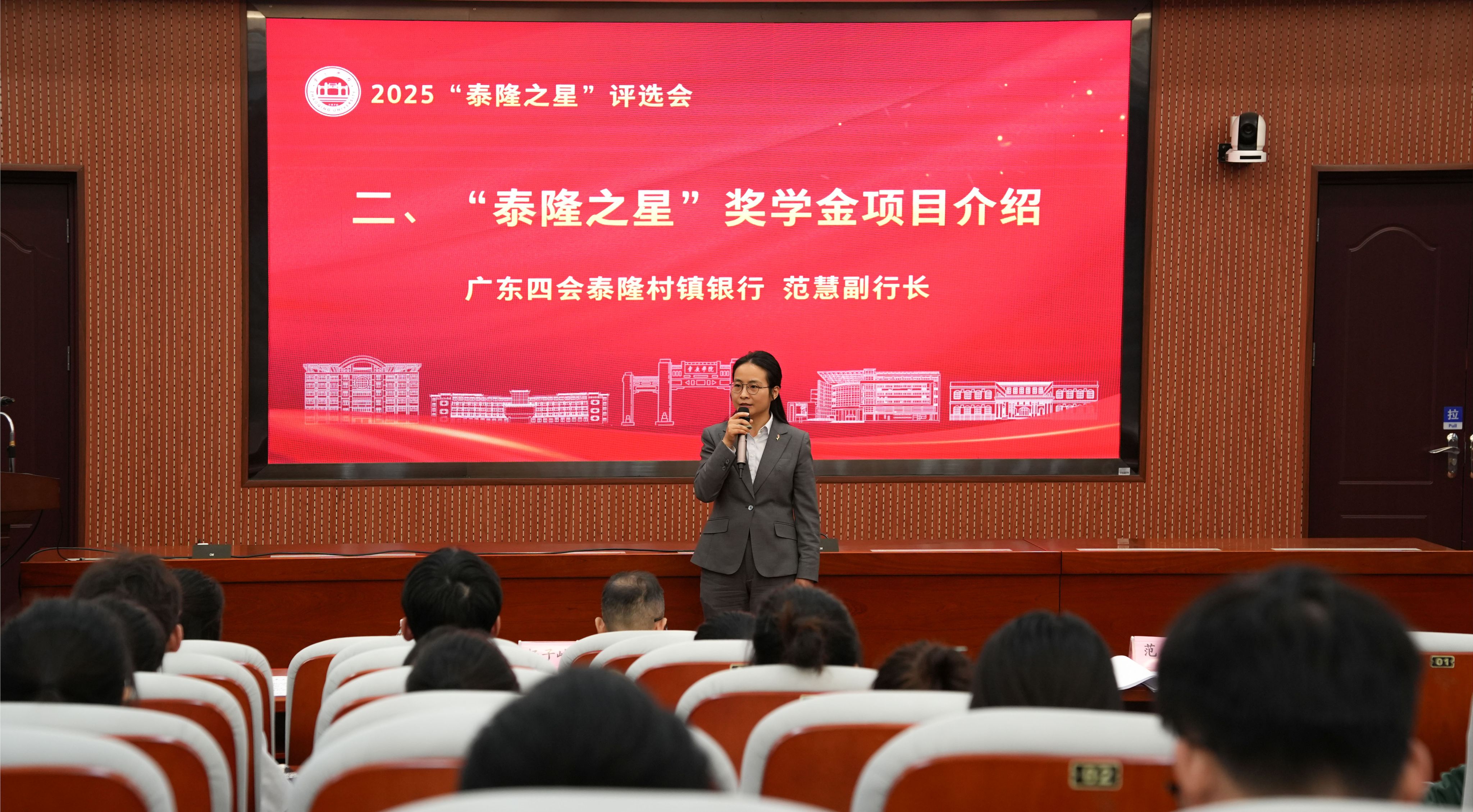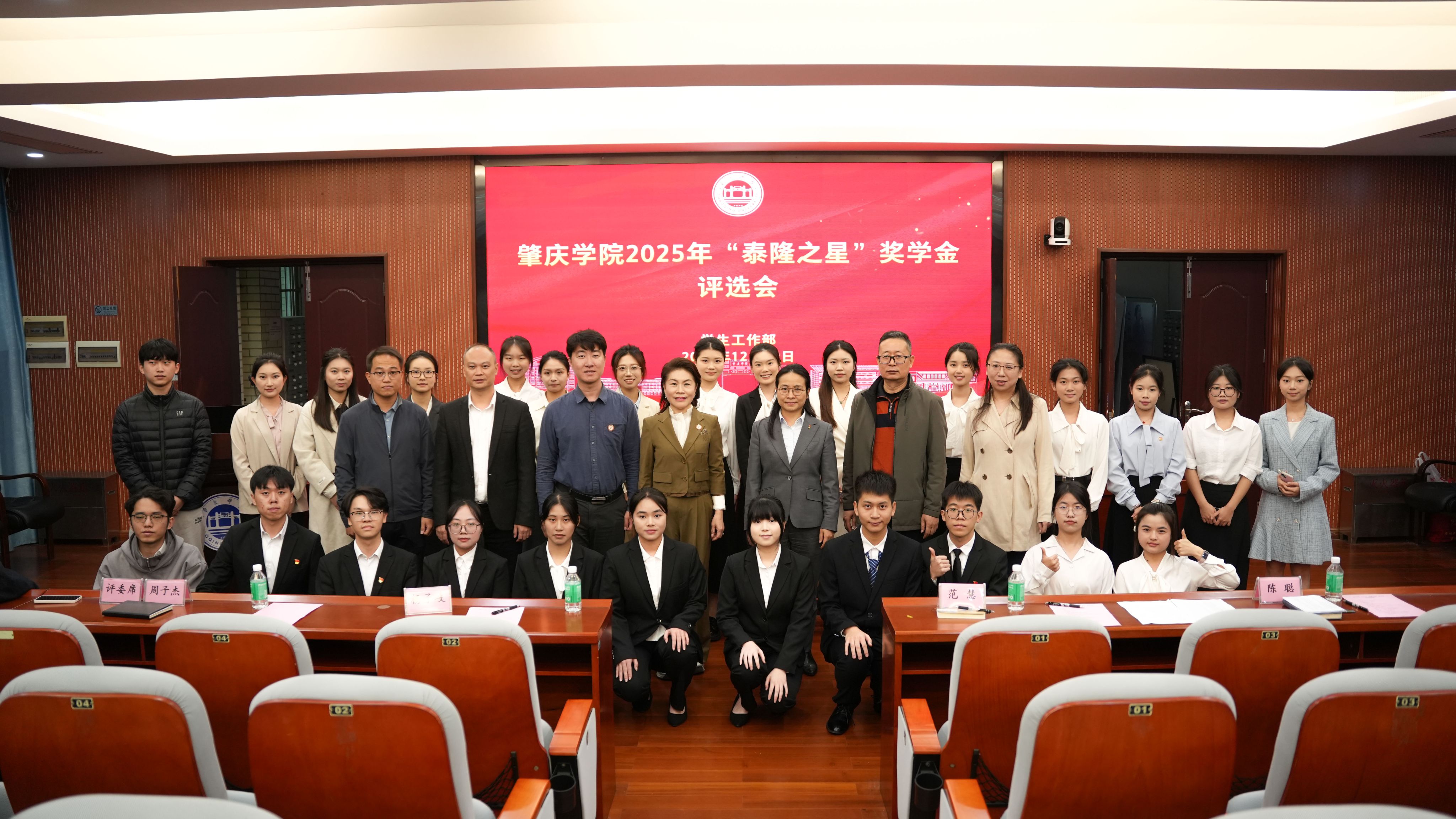 本网讯 12月10日下午,肇庆学院2025年“泰隆之星”奖学金评选会在行政楼第二会议室举行。广东四会泰隆村镇银行副行长范慧、学生工作部副部长周子杰、研究生院副院长陈聪、校团委副书记杨玉孟、校友会与基金会五级职员杨子岐出席,31名经初审推荐的候选学生参加评选。