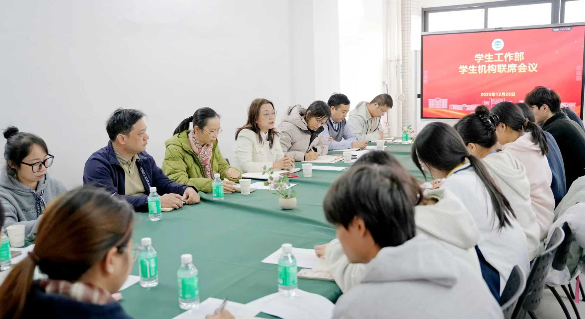 本网讯 为进一步加强学生机构建设,明确学生工作方向,压实学生骨干责任,提升学生骨干综合能力,学生工作部近日组织召开所属学生机构骨干联席会议,围绕机构职能定位、工作任务落实、队伍能力建设等方面进行系统部署与指导。学生工作部(招生与就业指导中心)部长(主任)陈玉华、副部长(副主任)董业凤,各学生机构指导老师及学生骨干代表出席会议。