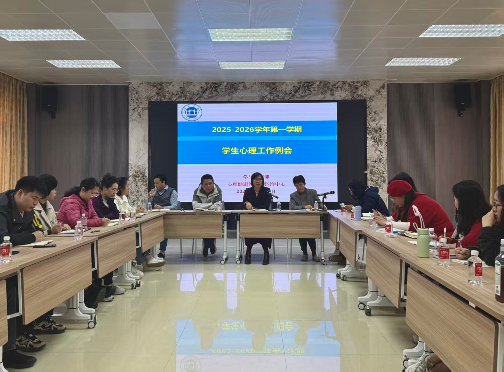 本网讯 12月31日,我校召开学期末学生心理健康工作会议,系统总结本学期工作成效,重点部署期末考试周及寒假期间的学生心理支持与安全保障工作,并对下学期心理工作进行布置。学生工作部副部长董业凤出席并讲话,心理健康教育与咨询中心副主任霍中开主持会议,各二级学院心理辅导站站长及心理中心全体专职教师参加会议。